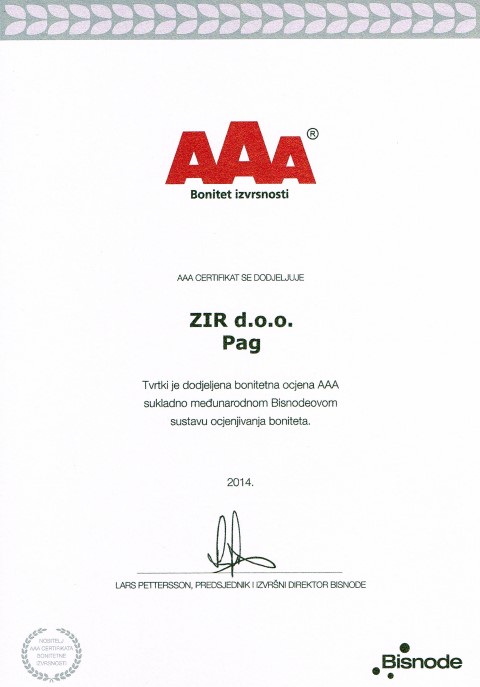 Izborom ZIR d.o.o. tvrtke garantirano odabirete kvalitetu i profesionalnost. S ponosom nosimo prestižni Certifikat bonitetne IZVRSNOSTI - Bisnode AAA.